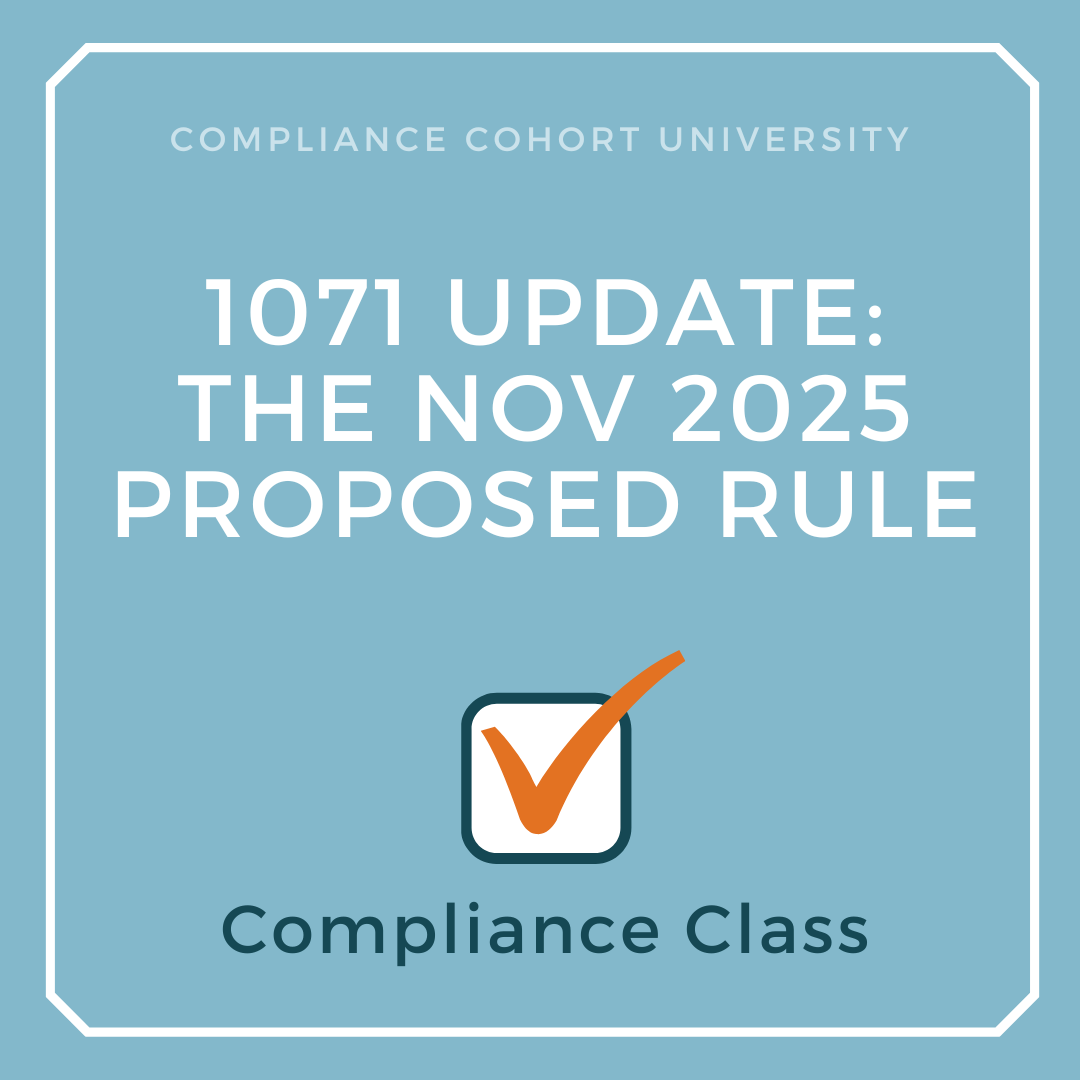 Welcome to the 1071 Update: The Nov 2025 Proposed Rule class!  This program has been designed to provide an update to the 1071 Final Rule. The program runs a total of 45 minutes. In addition to the video portion of the program, the comprehensive manual covers everything discussed in the video.